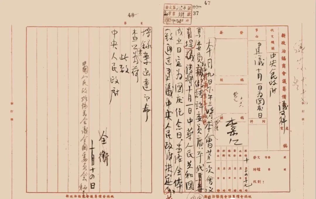 1949年10月9日,中国人民政治协商会议第一届全国委员会召开第一次会议。许广平委员发言:“马叙伦委员请假不能来,他托我来说,中华人民共和国的成立,应有国庆日,所以希望本会决定把10月1日定为国庆日。”林伯渠委员也发言附议,要求讨论决定。